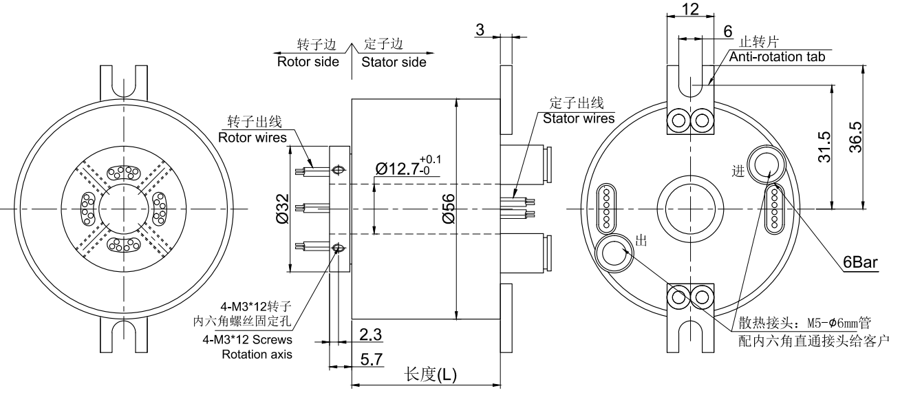 • · 高速過孔導電滑環,整體精密導電滑環,內孔12.7mm,外徑56mm,最高轉速12000RPM。