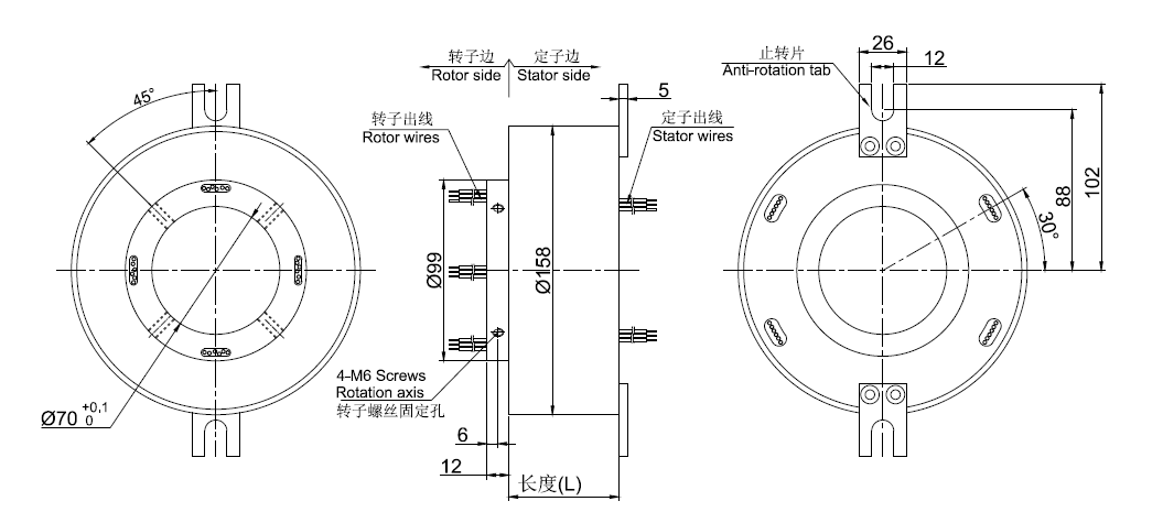 • · 外徑158mm, 通孔直徑為70mm(適用于<=70mm)的標準系列整體式精密導電滑環。*注意:如需<70mm的內孔,可通過加內襯軸套解決。