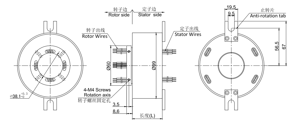 • · 外徑99mm, 通孔直徑為38.1mm,適用于<=38.1mm)的標準系列整體式精密導電滑環。*注意:如需<38.1mm的內孔,可通過加內襯軸套解決。