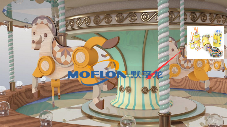 以安裝一部簡易的旋轉(zhuǎn)木馬為例,默孚龍科技設(shè)計(jì)時(shí)在其中心軸上使用五道滑環(huán)及碳刷,其中三道接三相電機(jī),兩道接220V照明。其中滑環(huán)在其中起到傳輸電流和避免線路纏繞的關(guān)鍵作用,大大的增加了旋轉(zhuǎn)木馬的使用壽命。